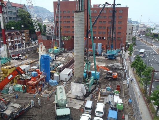 敷地南側では建物の基礎の一部となる地盤改良杭工事を開始しました。