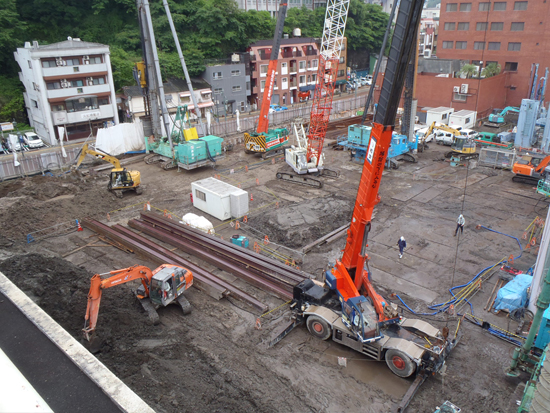 SMW(地中連続山留壁)工事を完了し杭打機の解体搬出を行っています。