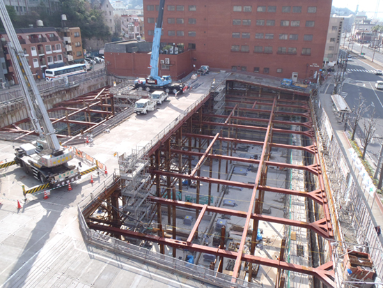 地下外周の擁壁の躯体工事と免震基礎躯体工事を行っています。