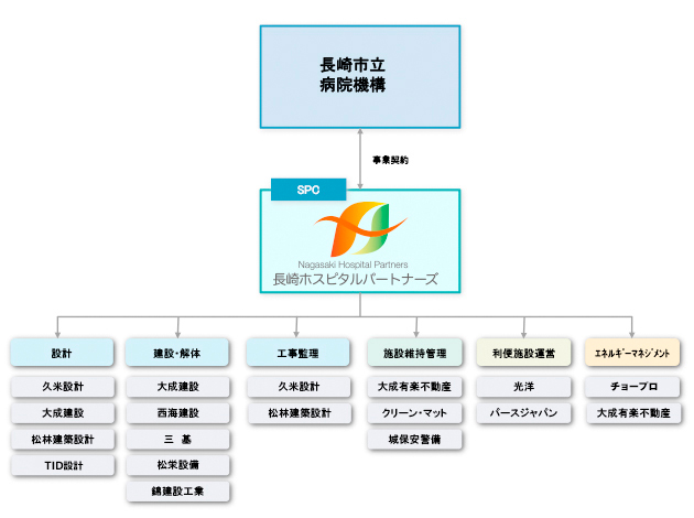 本事業においては、SPCである長崎ホスピタルパートナーズが、新病院の設計・建設・解体などの施設整備のほか、建物保守・清掃・警備などの維持管理および売店等利便施設運営を長崎市より包括的に受託し、各業務を実施するコンソーシアム企業13社(地元7社を含む)に再委託します。